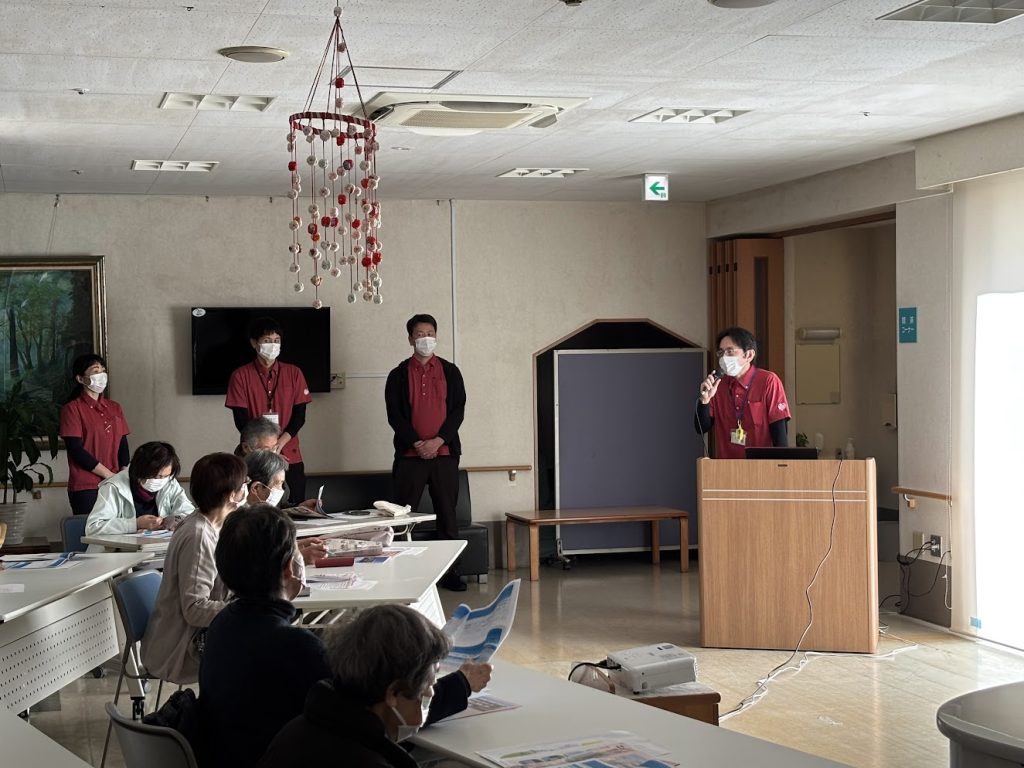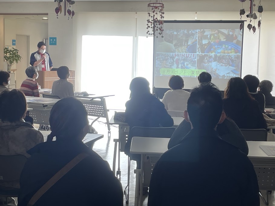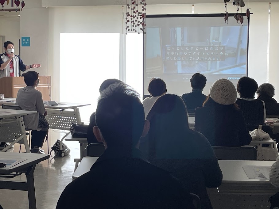 始めは副施設長が施設PR用に作成した動画のご紹介。施設独自の取り組みや地域交流についてお話しをさせて頂きました。