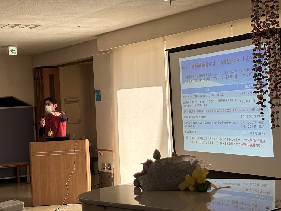 次に施設長が「特養入居とお金」をテーマにお話しさせて頂きました。「どうすれば特養に入れるのか?」「一体いくらかかるのか?」制度が複雑で分かりにくいですからね…