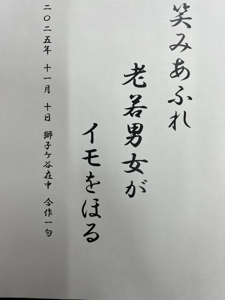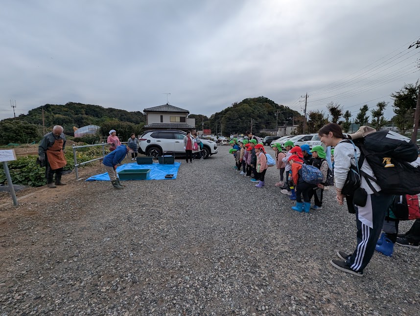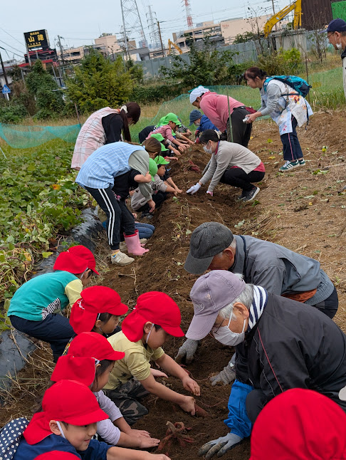 小さい子供も先生も、職員とご近所の有志の方々も一緒に。一列縦隊で仲良くイモ掘り。
