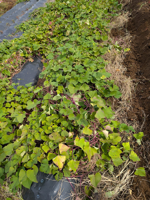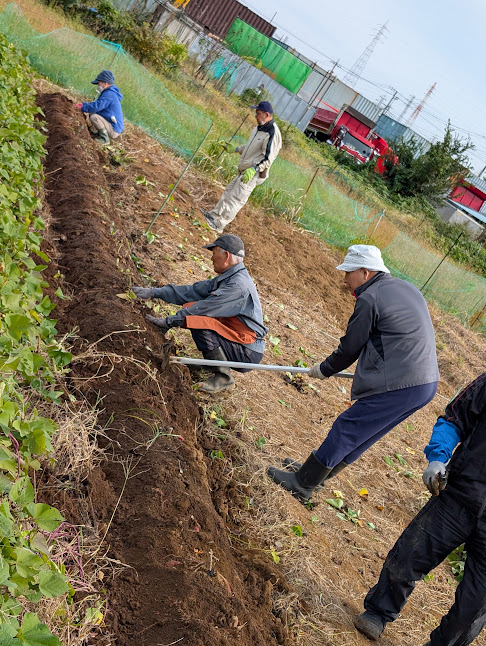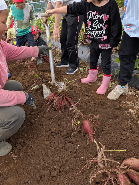 土の中にイモがある為、実り多いのか少ないのか、大きく育っているのか小さいのか、掘り出してみるのが楽しみです。イモ掘りの前に畝(うね)を綺麗に。