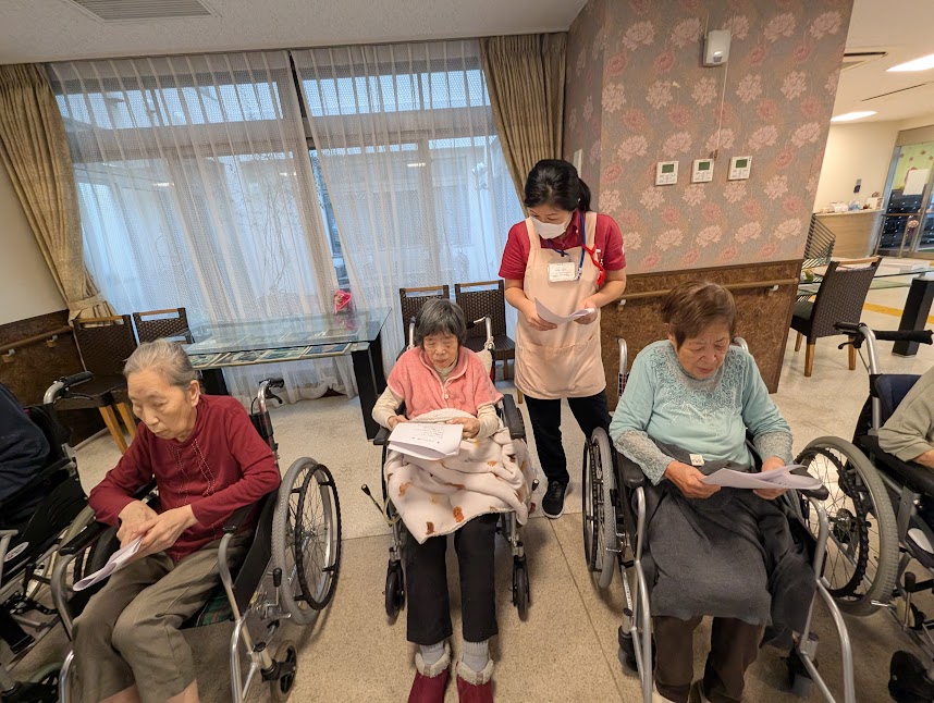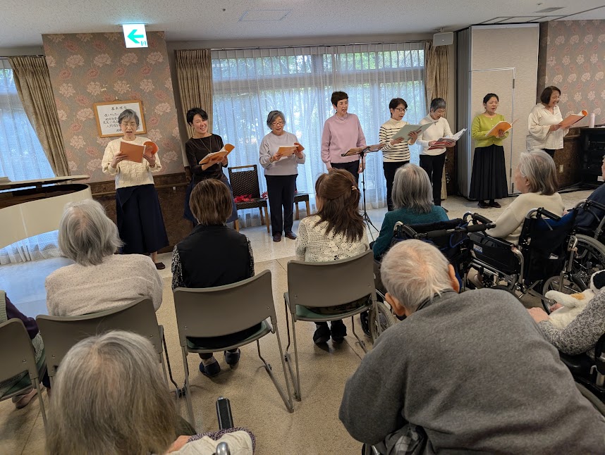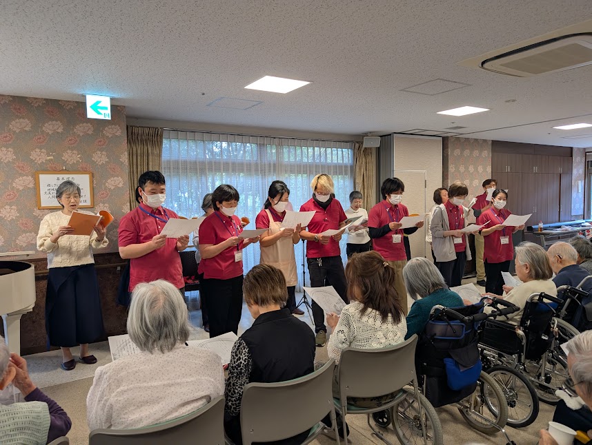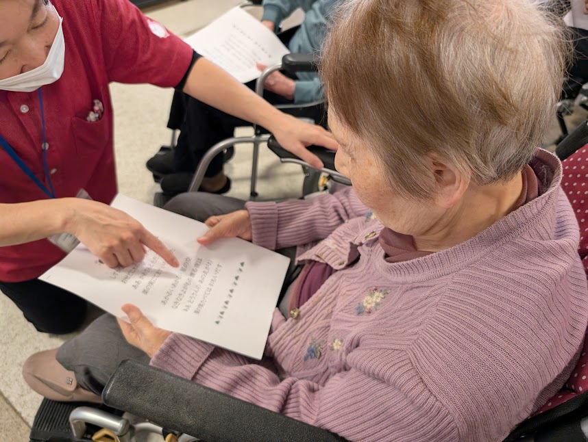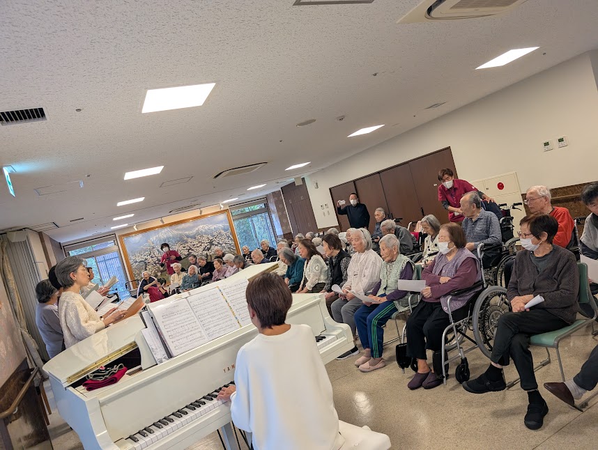 皆で歌詞を見ながら大合唱。ピアノの音を聞きながら声の調子を合わせて歌詞を目で追うのはなかなか大変。今どこだっけと聞いたり聞かれたり。