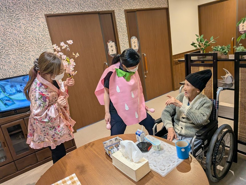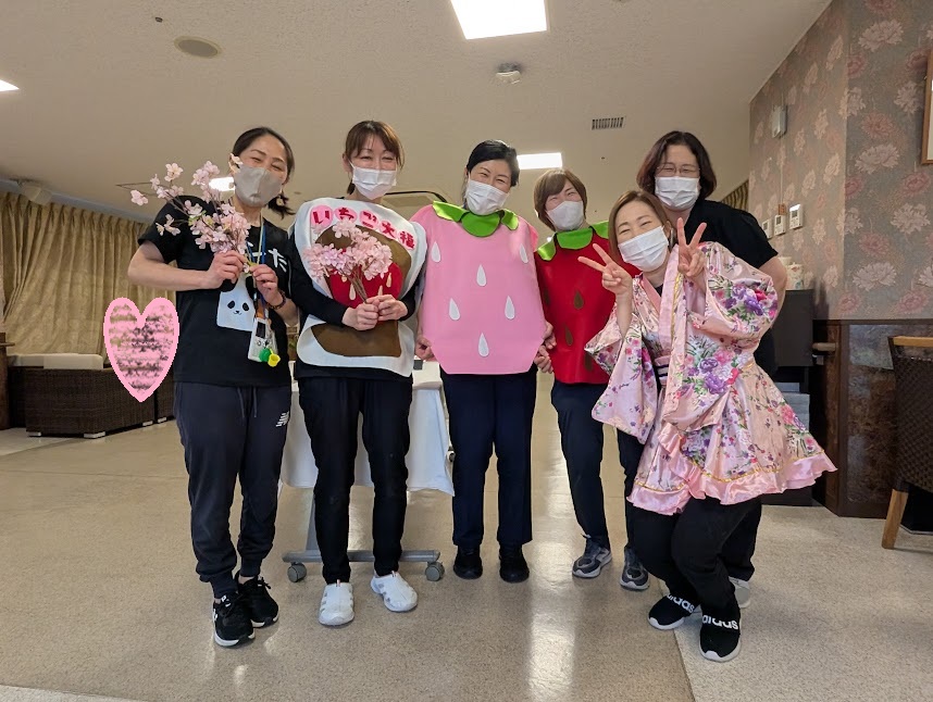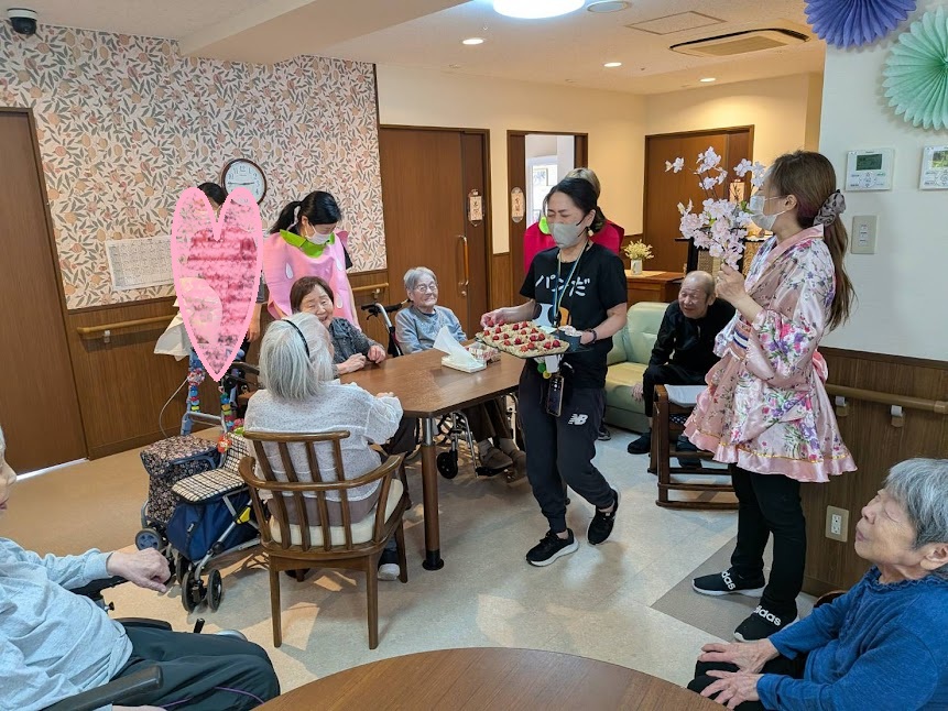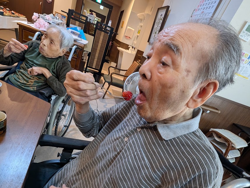 花をみて輝く笑顔と大福をみて輝く笑顔。どちらもとても良い笑顔でした。笑顔があるから良いという訳ではありませんが、ないよりはあった方が良いかなと思っています。今の世の中いつでも何でもある時代。くだものにも四季があるそうです。季節を楽しみ、生活を楽しみ、今年度も楽しく過ごしていけたらと思います。